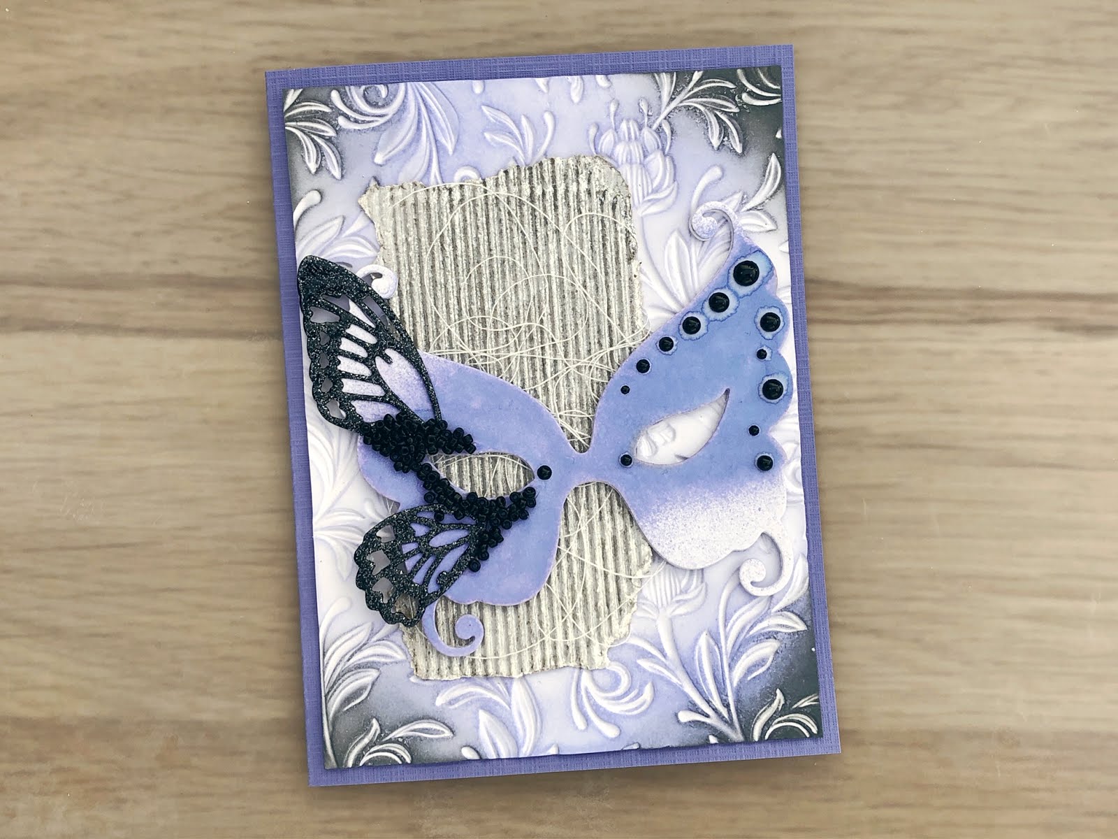 I used I piece of corrugated cardboard to add behind the mask that I coloured with Nuvo – Glacier Paste – Quicksilver ( SBC | CST | CRF | TNCUK | TNC )