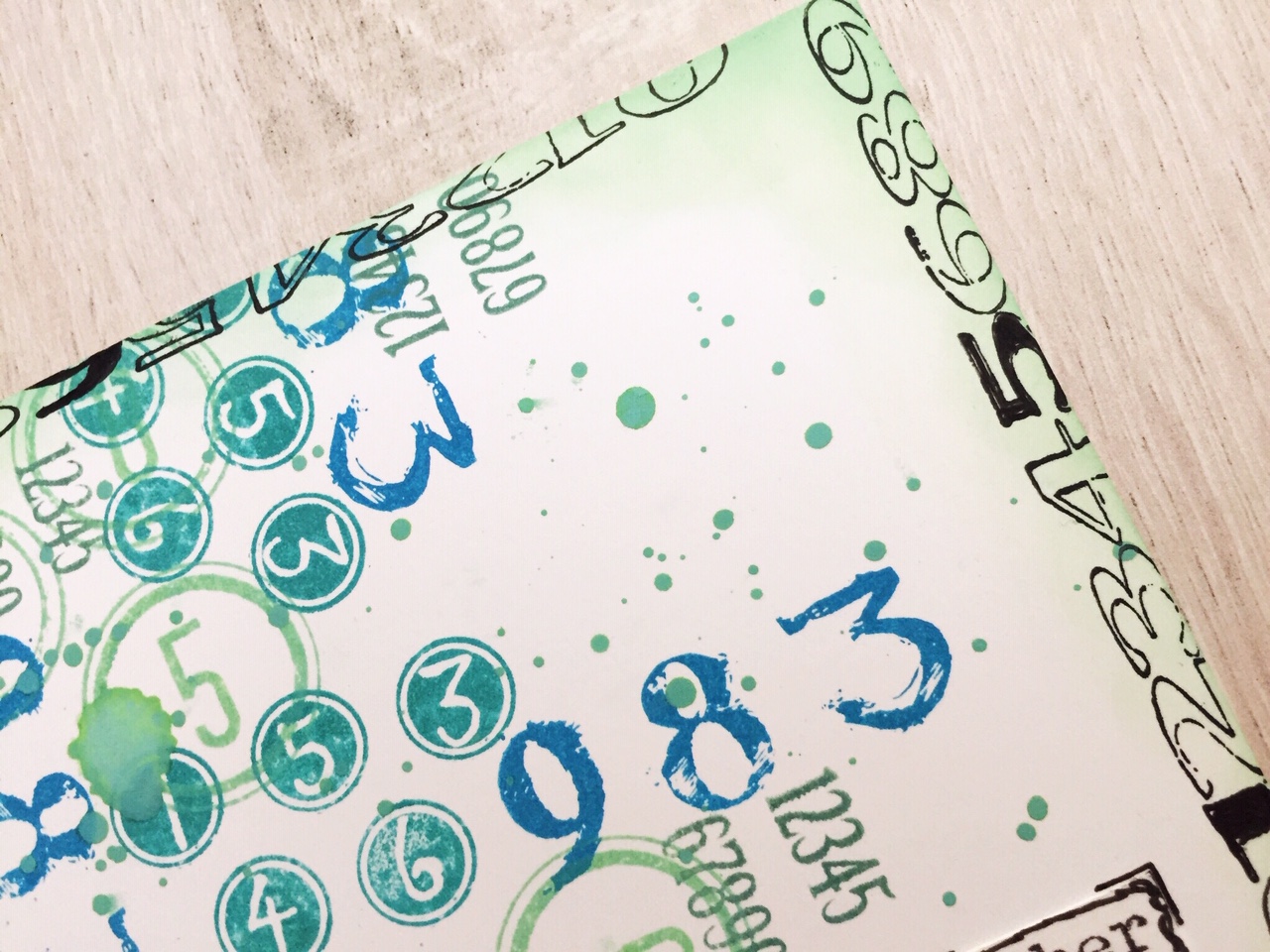I used the stamps to make layers in different colours in a blue green colour scheme so the colours blend and stand out at the same time.