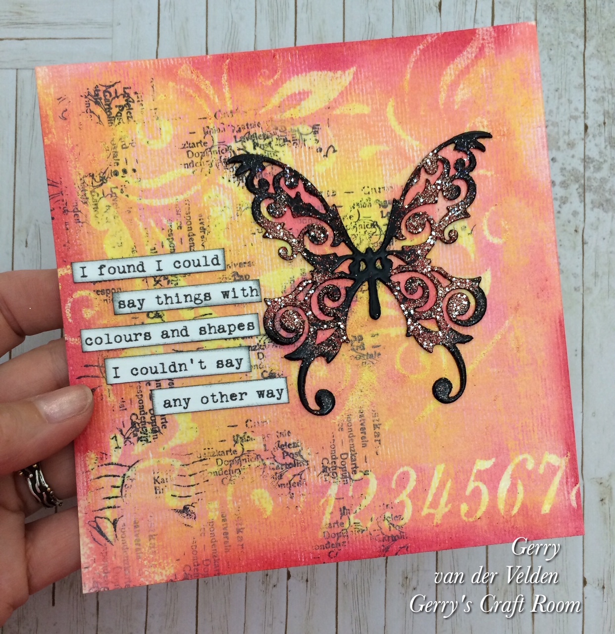 Voor de achtergrond heb ik een resist-techniek gebruikt met stencils en een paar lagen gelatos in verschillende kleuren