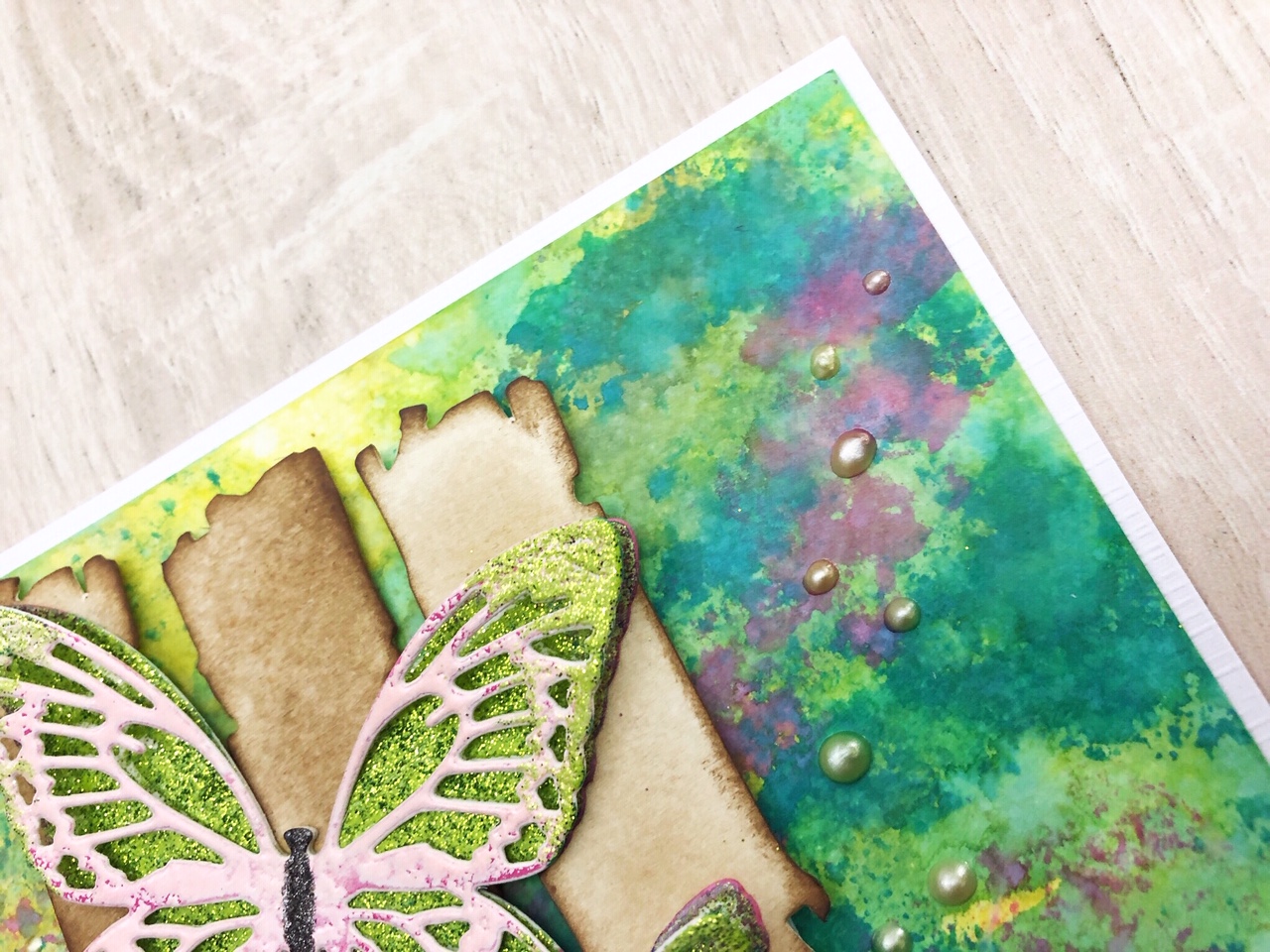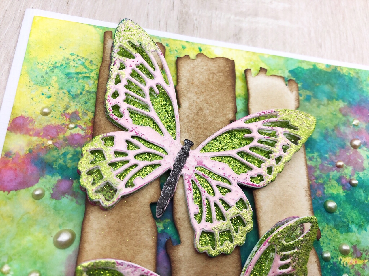 a card with lots of colors, it’s almost spring:-) I’ve applied distress oxide ink in different ways and used different techniques with embossing powder to color the butterfly.