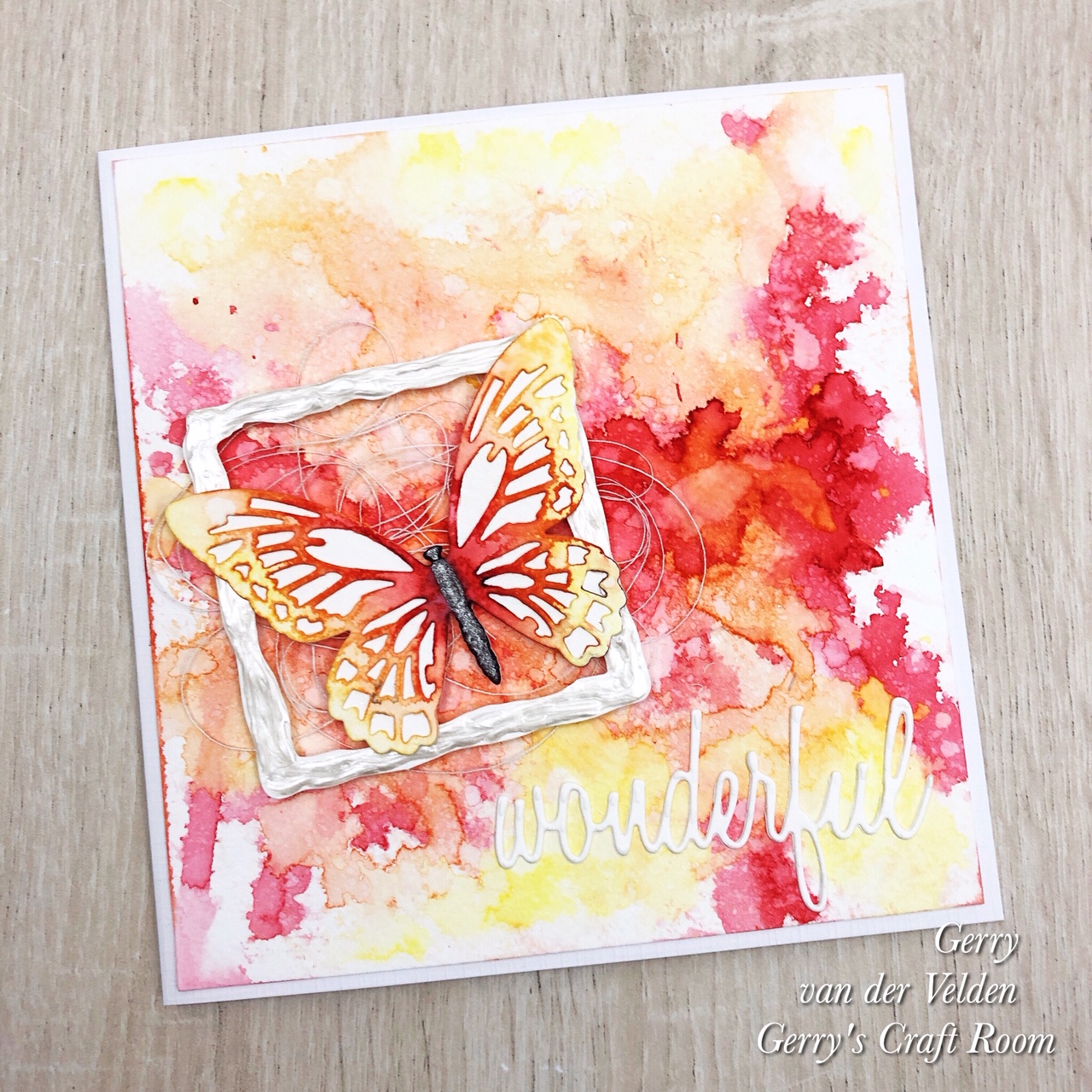 Hallo lieve knutsel vrienden, vandaag heb ik een vrolijke kaart met een leuke Nuvo Aqua flow achtergrond en de Tim Holtz Vlinder.