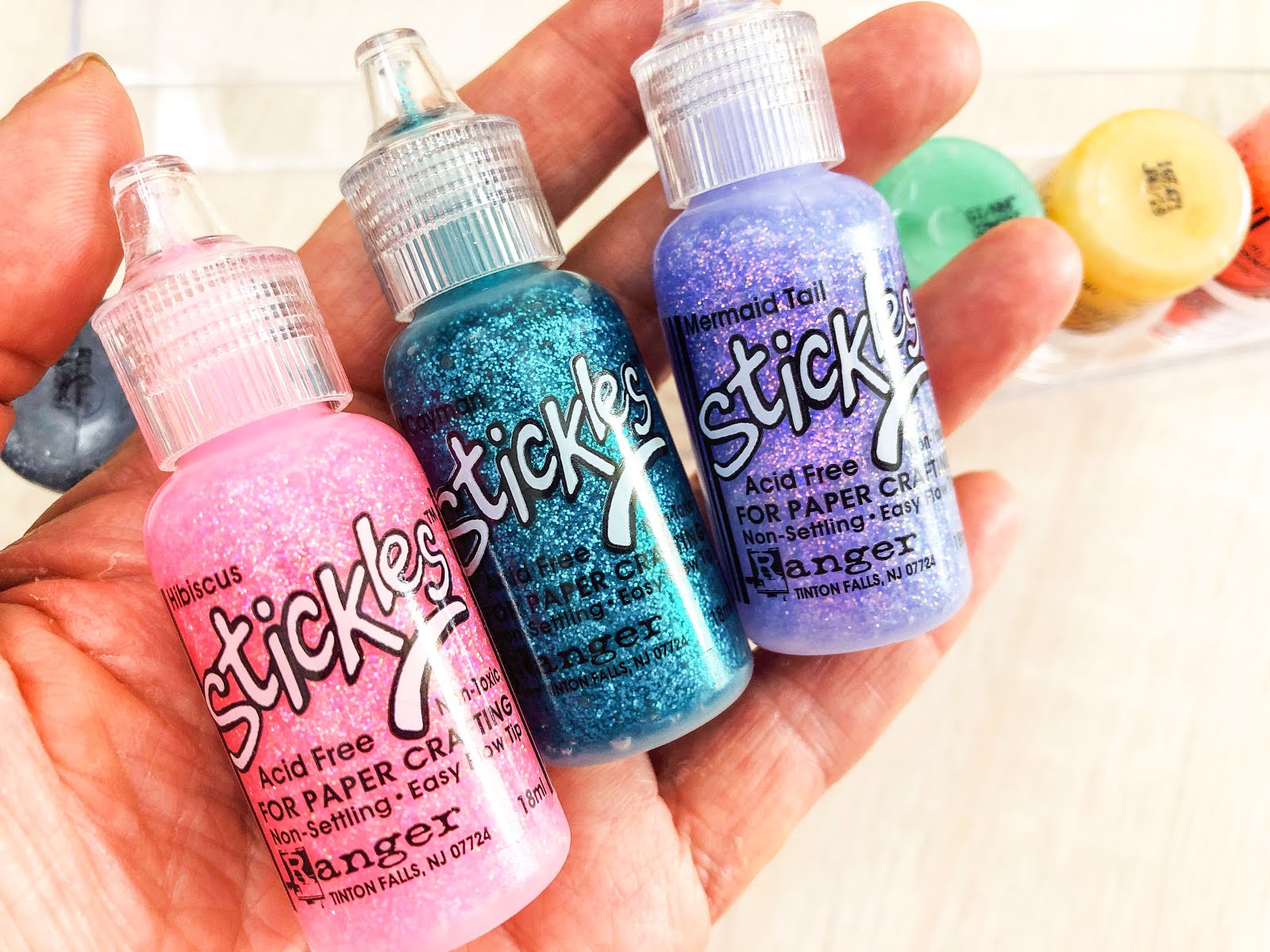 On the Scrapbook.com blog there are lots of fun articles about all sorts of crafts, tools and products. These are jam packed with valuable information that is really helpful and you can check out for free. One of the articles is about Glitter glues. Among them are Ranger Stickles & Nuvo Drops. You can find the Quick guide to Stickles, Nuvo Drops and glitter glues here