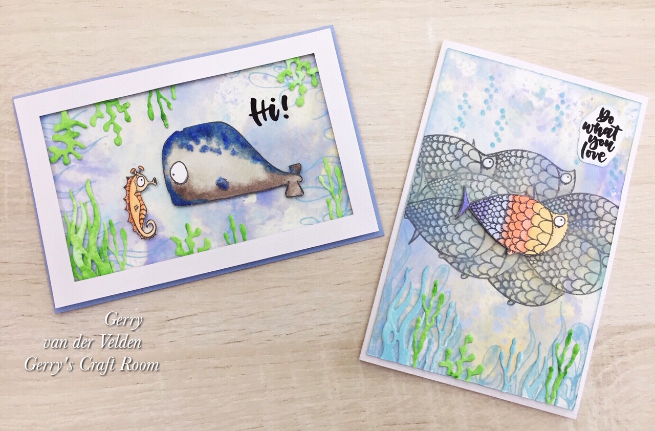 Hallo lieve knutsel vrienden, vandaag heb ik twee kaarten met stempels van het eigen merk van Craft Emotions, de schattige visjes. Ik heb een achtergrond gemaakt met een eenvoudig spat techniek en ik heb op verschillende manieren laagjes gemaak tom wat meer dimensie te krijgen.