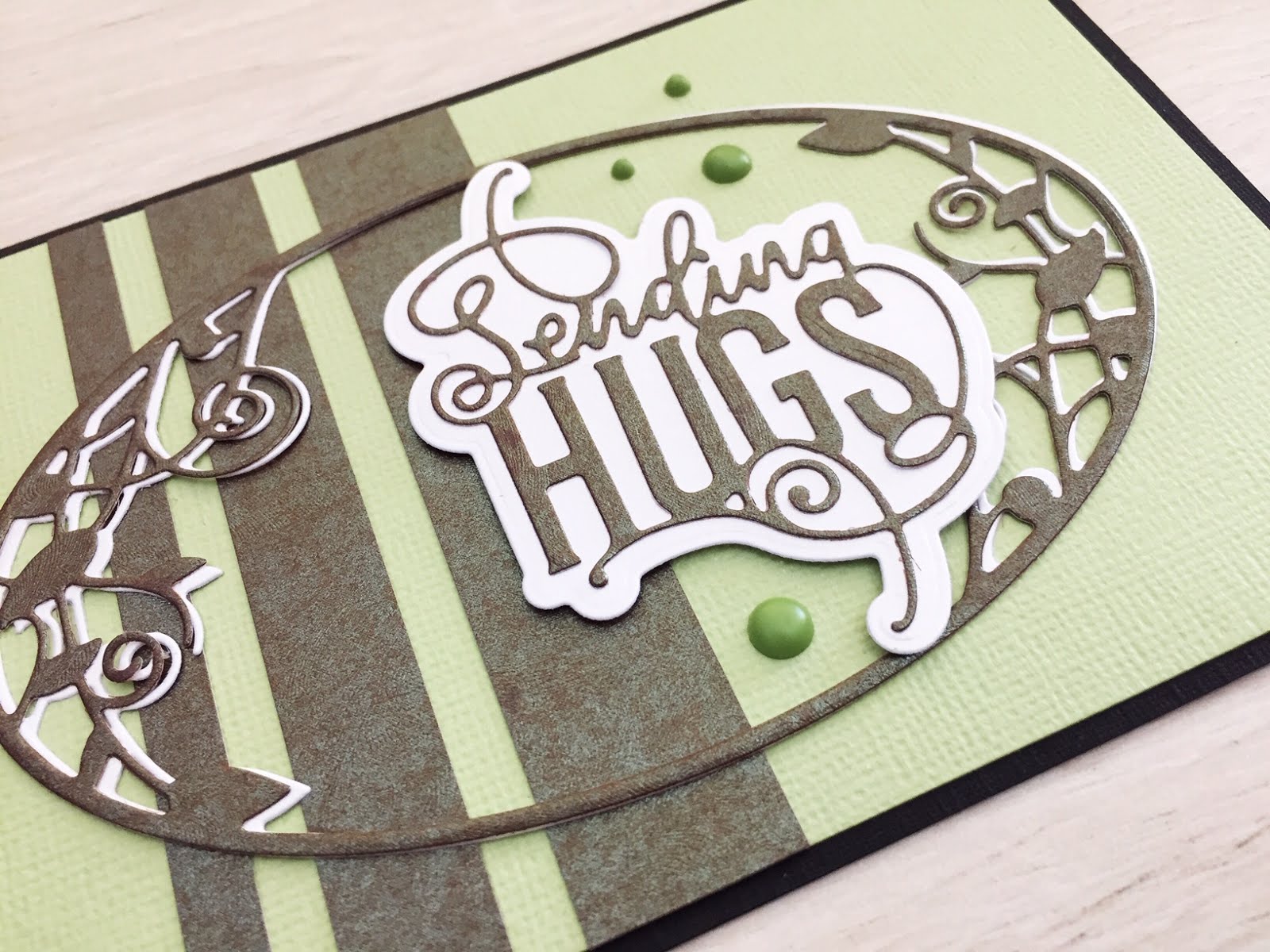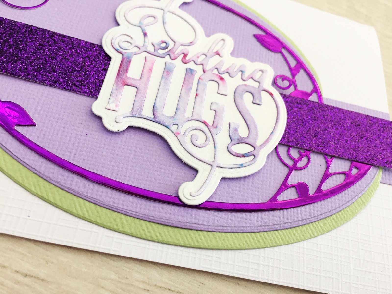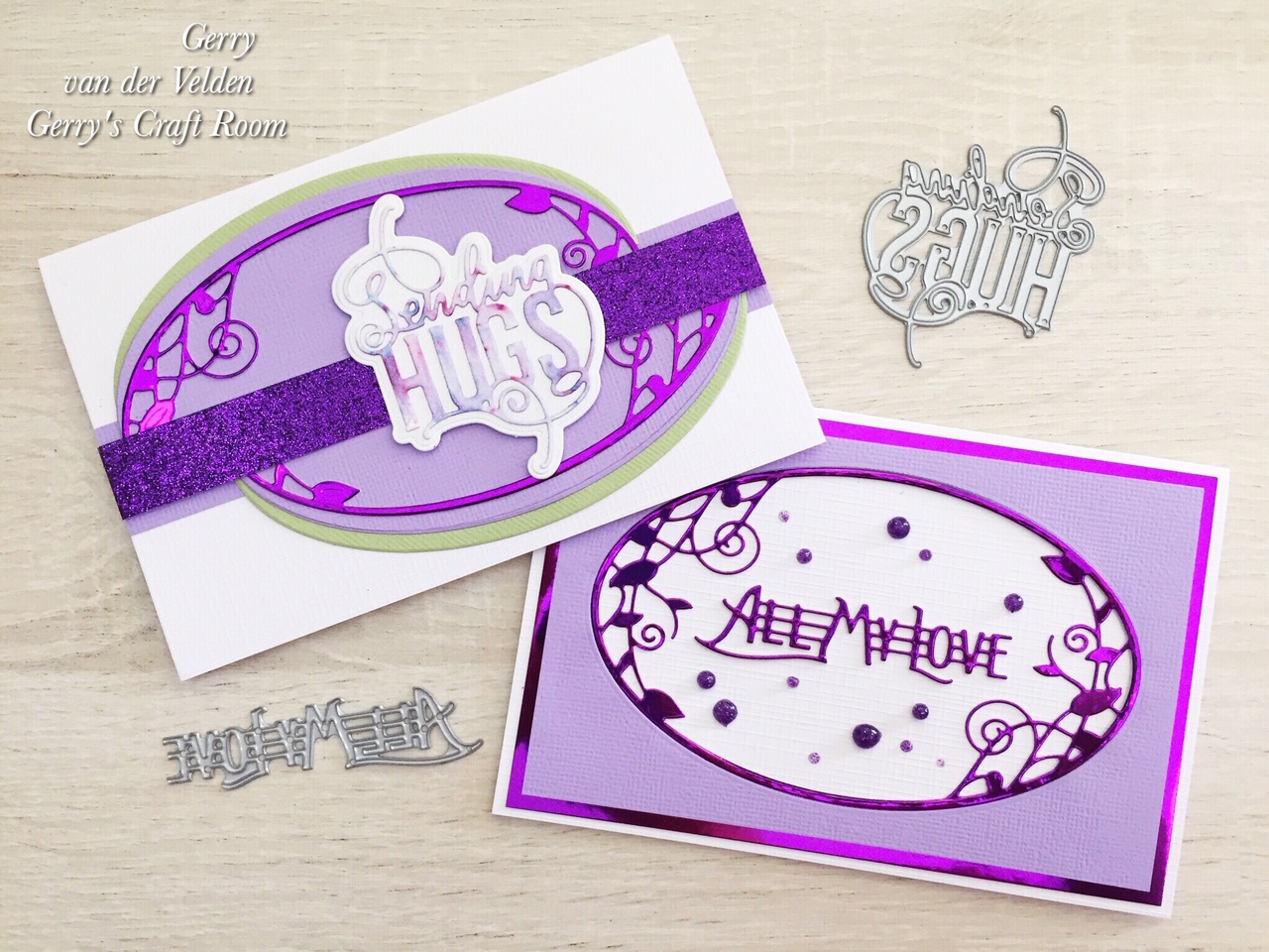 En nog een kaart met wat meer stappen en hier heb ik de ovaal gebruikt die uit de vorige kaart kwam. Voor de tekst heb ik Shimmer Powder gebruikt met de mooie paarse kleur en glans.